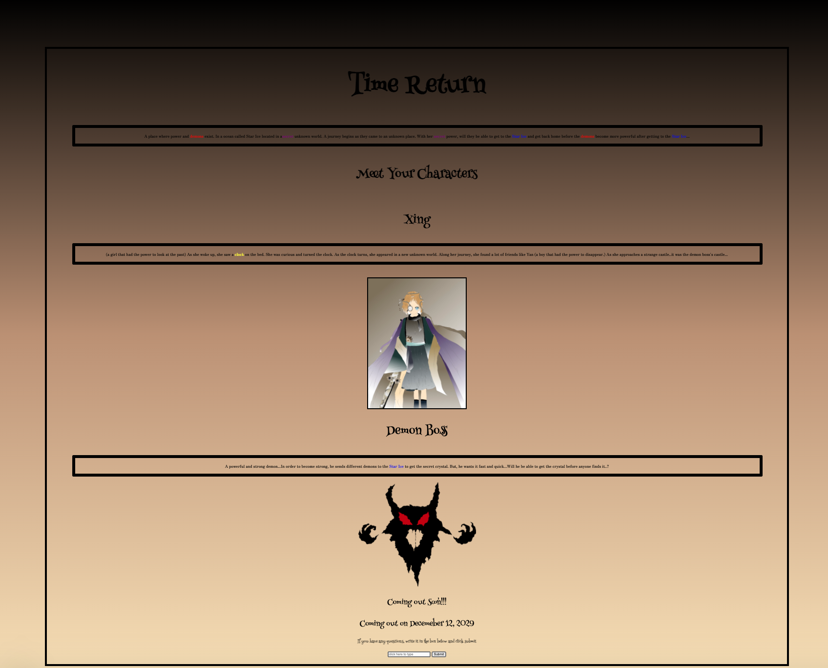 When making the movie webpage, we used different HTML and CSS code like heading, div, span, padding, border, margin, paragraph, google fonts, and many more. In addition, when doing the webpage, there were many challenges and many new skills I learned during this project. The challenges when doing this project was planning out what the project will be about. When doing this project, the new skills I learned is collabration, Growth Mindset, embracing failure, problem decomposition, and creativity. During this project, me and my partner communicate and work together when planning and writing out the codes. In addition, we faced different codes that didn't work, but we looked through our notes and try different things to see if the code works. The project helped us think about different creative ideas that we wanted to create for the project. Next time, I would add a audio to the trailer for my movie webpage project. In addition, next time I would use differnt style for the words that uses the code span and change the size, font, and color of the word.